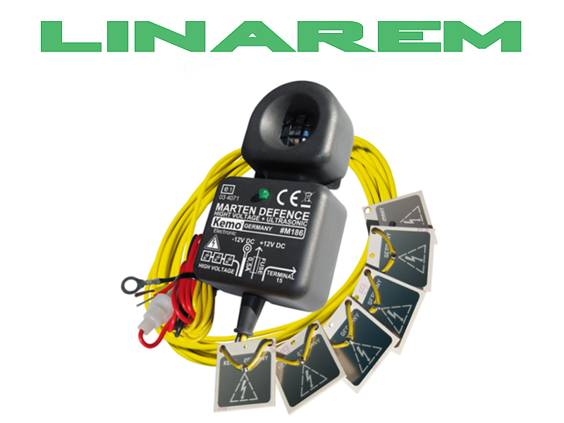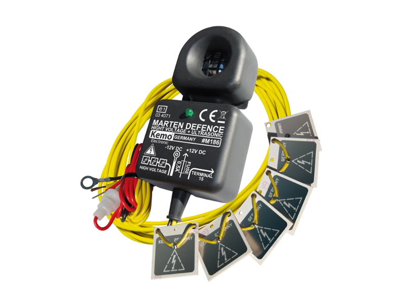 Odstraszacz kun i gryzoni Kemo M186 to produkt niemieckiego producenta Kemo Electronic. Urządzenie charakteryzuje się wyjątkowo niskim poborem prądu < 0,005A, odstraszacz automatycznie się wyłącza przy napięciu akumulatora powyżej 11,5 V/DC. Samochodowy odstraszacz kun Kemo M186 pozwala na zabezpieczenie samochodu przed obecnością łasicowatych oraz kun. Urządzenie zostało wyposażone w 6 płytek przez które przepływa napięcie 200-300 V/DC (niskie impulsy elektryczne wywołujące szok u zwierzęcia które ich dotknie). Samochodowy odstraszacz na kuny Kemo M186 dodatkowo emituje silne i agresywne ultradźwięki które wywołują uczucie dyskomfortu u odstraszanych zwierząt.