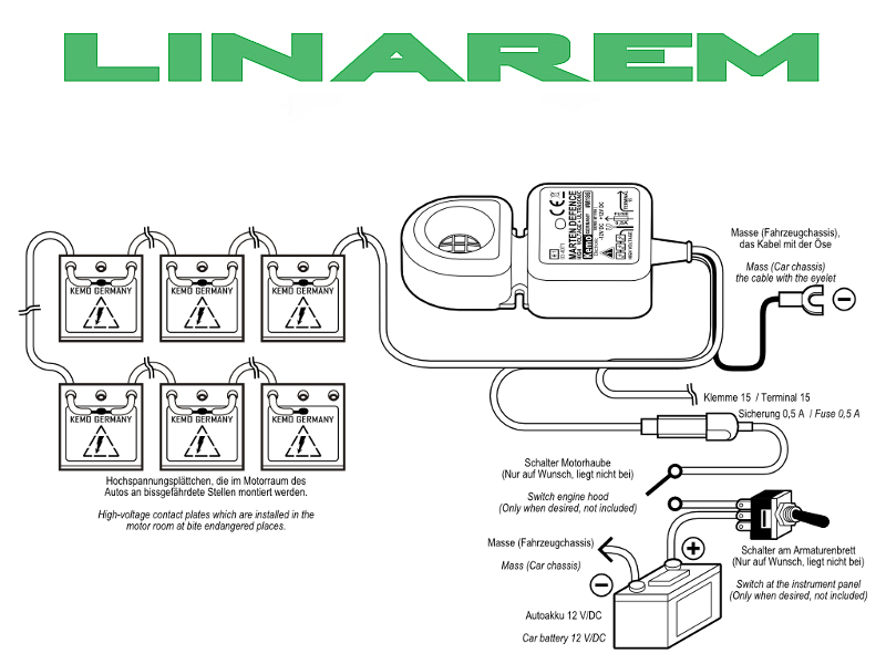 W trakcie montażu samochodowego odstraszacza kun proszę wyjąć bezpiecznik urządzenia z podstawy bezpiecznika. Urządzenie należy zamontować w suchym miejscu pojazdu, w którym temperatura nie jest zbyt wysoka. Kabel dodatni ze zintegrowaną obudową bezpiecznika podłączyć do zasilania "+12 V". Przewód masy podłączyć do zacisku masy "-12V". Kabel do „zacisku 15” należy podłączyć do „styku 15” pokładowej sieci elektrycznej pojazdu. Styk ten znajduje się najczęściej przy stacyjce zapłonu, lub przy wtyczce Euro radia samochodowego.